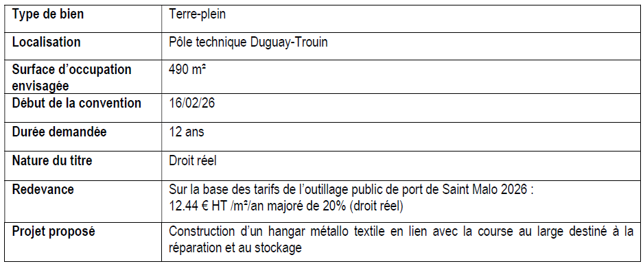 En application des dispositions de l’article L. 2122-1-4 du code général de la propriété des personnes publiques, le présent avis de publicité a pour objet de porter à la connaissance des opérateurs économiques la manifestation d’intérêt spontanée d’une entreprise en vue de l’occupation d’une parcelle du domaine public portuaire de Saint-Malo.